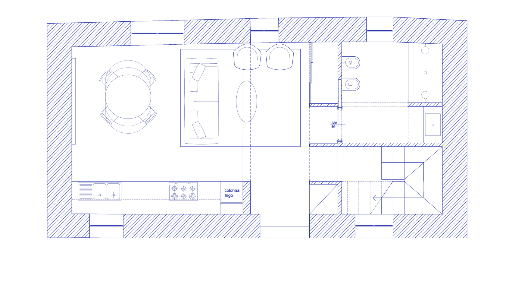 La sua abitazione di due piani è da rinnovare completamente, deve essere resa più comoda e confortevole e deve tener conto di una specifica caratteristica: essere accogliente. Come dicevamo, qui durante l’estate vengono tutti. C’è quindi bisogno di un grande tavolo dove tutti si possano accomodare e di quanti più posti letto possibile. Ecco che inizia il nostro progetto.